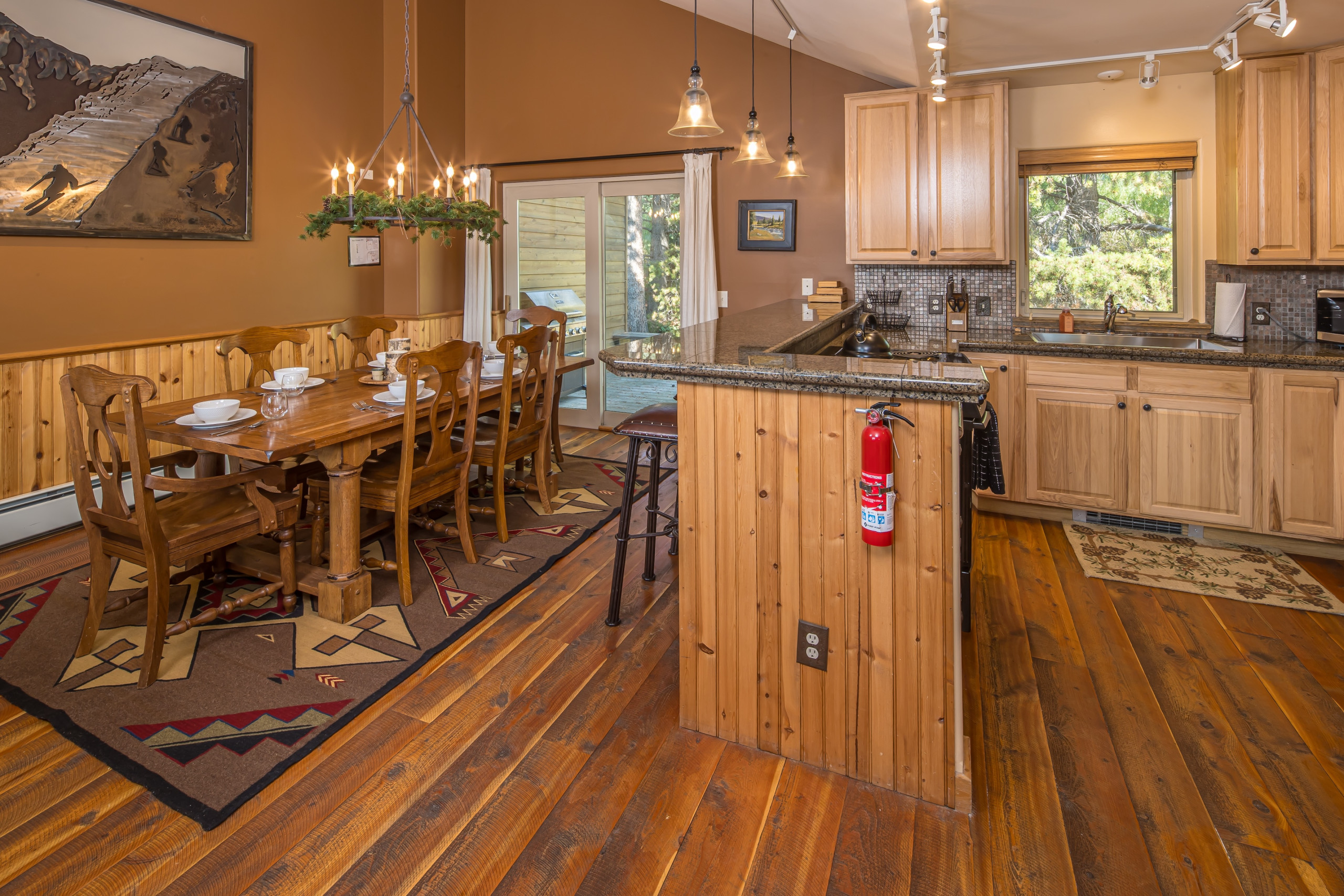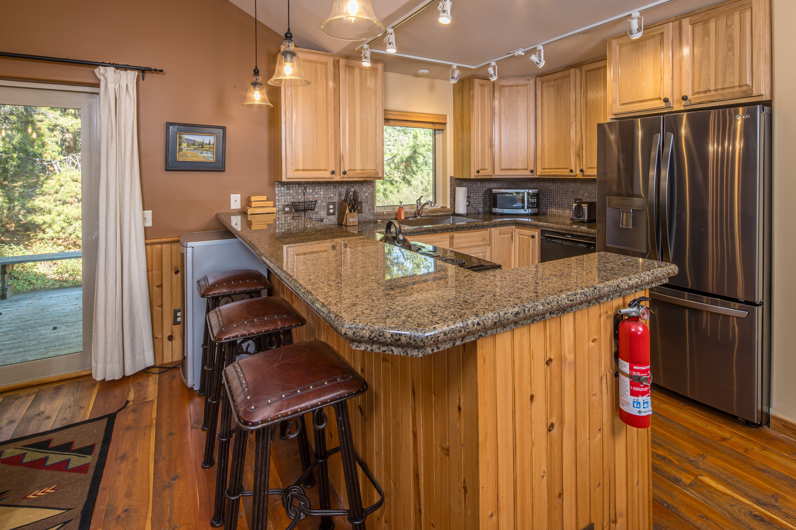 Inside, you'll find three comfortable bedrooms featuring two king-size beds and one queen-size bed, ensuring a restful night's sleep for everyone. The home includes 2.5 bathrooms, providing ample space and convenience for guests. The fully-equipped kitchen comes complete with essential appliances including a refrigerator, dishwasher, coffee machine, oven, microwave, and all necessary kitchenware. Guests will also find a washer and dryer, ample parking (1 car garage and up to 3 driveway parking spots), and a patio off of the dining room with a propane BBQ grill. In addition a gas fireplace in the living room adds a cozy touch for those chilly mountain days.